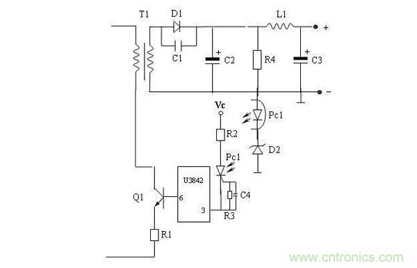 經檢查此開關電源采用U3842 PWM控制芯片,經查找相關的資料得知,當U3842芯片的3端電壓高于1伏時,內部電流敏感比較器輸出高電平,將PWM鎖存器復位使輸出關閉。通電測量U3842的3端高于1伏,6端無輸出,經檢查相關電路,發(fā)現穩(wěn)壓管D2擊穿,如圖3,故PC1導通,致使U3842的3端為高電平,故6端無輸出,開關管不工作,直流側無直流輸出。更換同型號穩(wěn)壓管D2,故障解除。