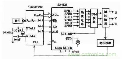 以SA4828與單片機C8051F020為核心構成的控制器電路設計如圖4所示。控制電路根據(jù)給定的參數(shù)輸出三相SPWM信號給智能功率模塊IP-M,實現(xiàn)對功率晶體管的通斷控制。C8051F020通過8位P0端口與SA4828的地址、數(shù)據(jù)管腳AD0~AD7相連,工作時,單片機首先對SA4828進行初始化,定義載波頻率,電源頻率范圍、死區(qū)、最小脈沖取消時間等參數(shù)。然后向SA4828的控制寄存器傳送電源的頻率控制字和幅度控制字等參數(shù)。正常工作時,根據(jù)需要對SA4828的控制數(shù)據(jù)進行修改,實現(xiàn)系統(tǒng)的反饋與實時控制,以及調壓控制。為實現(xiàn)系統(tǒng)的穩(wěn)壓功能,采用平均值反饋PI調節(jié)。輸出電壓經(jīng)隔離送入C8051F020單片機的A/D轉換口即P3.0口,轉換結果參與PI運算,運算結果即為SA4828幅度控制寄存器的控制字。從RPHT~BPHB的6個引腳輸出相應頻率和電壓的SPWM控制信號,經(jīng)隔離電路后,分別控制智能功率模塊IPM的6個IGBT的導通與截止,最后在3個輸出端上產(chǎn)生對稱的三相SPWM電壓。SA4828作為單片機的外設,與單片機并聯(lián),通過對單片機編程,只需將SPWM的初始化信息和控制信息寫入SA4828的相關寄存器,即產(chǎn)生精確的全數(shù)字化的三相的SPWM波形。