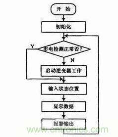 單片機在初始化程序中完成對單片機、SA4828以及其他可編程器件的初始化,接著對市電進行檢測,如果市電不正常,則啟動逆變器工作,通過控制將開關元件切換至逆變器輸出。并將輸入狀態(tài)存入控制寄存器,顯示數(shù)據(jù),如果輸出電壓或保護等發(fā)生改變,則報警輸出以采取措施使系統(tǒng)正常運行。