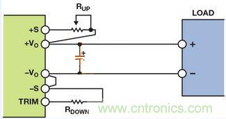 輸出電壓可通過改變連接電源模塊正輸出端或接地端的電阻來進(jìn)行調(diào)節(jié)通過連接外部電阻RUP并使RDOWN浮空,可以向上調(diào)整輸出電壓(高于標(biāo)稱輸出電壓),或者通過連接外部電阻RDOWN并使RUP短路(電阻值為零)向下調(diào)整(低于標(biāo)稱輸出電壓)。