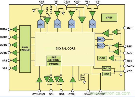 該器件非常適合高密度DC-DC電源轉(zhuǎn)換,具有6個(gè)可編程脈沖寬度調(diào)制(PWM)輸出,可控制大部分高效電源拓?fù)?。另外,該器件還能控制同步整流(SR),并集成6個(gè)模數(shù)轉(zhuǎn)換器(ADC),能夠采樣模擬輸入電壓、輸入電流、輸出電壓、輸出電流、溫度以及其它參數(shù)。轉(zhuǎn)換為數(shù)據(jù)后,將這些信號發(fā)送至數(shù)字內(nèi)核模塊進(jìn)行處理。該器件采用靈活的狀態(tài)機(jī)架構(gòu),以硬件實(shí)現(xiàn)全部功能,提供穩(wěn)定可靠的解決方案,但無法通過編程實(shí)現(xiàn)設(shè)計(jì)以外的功能。器件的全部功能--包括輸出電壓調(diào)整--均以數(shù)字方式處理。為了調(diào)整輸出電壓,應(yīng)通過PMBus接口發(fā)送一條命令,改變數(shù)字基準(zhǔn)電壓值。