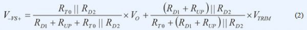 VS+引腳上的正常工作電壓為1V。若 VTRIM為1V左右且RT0遠(yuǎn)大于RD2,則可忽略電路的其余分支部分。復(fù)合網(wǎng)絡(luò)用作簡單分壓器,并調(diào)節(jié)RUP電阻值,提供類似于模擬控制器的特性,實(shí)現(xiàn)了模擬電源模塊中的電壓向上調(diào)整。