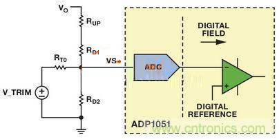 考慮整個(gè)控制環(huán)路,輸出電壓通過電壓分壓器或者運(yùn)算放大器縮放到合適的值,然后輸入給VS+引腳。ADC對該電壓進(jìn)行采樣。數(shù)字內(nèi)核知道數(shù)字化的輸出電壓值只采用邏輯電平信號工作,因此無法使用外部基準(zhǔn)電壓并旁路內(nèi)部比較器和濾波器。受限于這種固定的硬件配置,向后兼容現(xiàn)有模擬調(diào)整功能的唯一途徑是調(diào)節(jié)VS+引腳上的ADC檢測電壓。一種方法是重新配置反饋網(wǎng)絡(luò)。