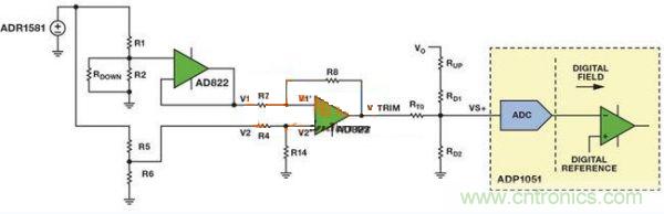 圖5中的電路具有兼容模擬向上或者向下調(diào)壓的功能兩個(gè)電阻分壓器產(chǎn)生兩個(gè)基準(zhǔn)電壓,其中一個(gè)基準(zhǔn)電壓表示模擬控制器所需的輸出基準(zhǔn)電壓,另一個(gè)表示內(nèi)部基準(zhǔn)電壓。利用一個(gè)電壓跟隨器來避免所需的輸出基準(zhǔn)電壓與后續(xù)電路相互影響。利用AD822 FET輸入運(yùn)算放大器,將所需的輸出基準(zhǔn)電壓(V1)從模擬控制器的內(nèi)部基準(zhǔn)電壓(V2)中去除,得到所需的電壓差。此電路的線性放大增益確保了VTRIM足夠大,從而能對VVS+產(chǎn)生影響。