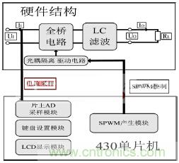 考慮到系統(tǒng)效率,不需要進(jìn)行boost升壓,可以直接逆變。故本系統(tǒng)結(jié)構(gòu)圖如圖1所示。SPWM信號(hào)控制硬件全橋電路,然后經(jīng)過(guò)LC濾波電路可以得到正弦波。以MSP430單片機(jī)為核心的數(shù)字控制系統(tǒng)需要采樣電流量、控制硬件電路系統(tǒng)以及形成良好的人際交互界面。