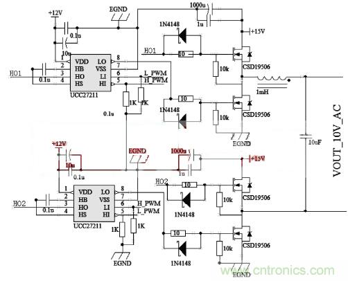 可以濾除載波頻率??紤]到MOS管需要相對(duì)較小的導(dǎo)通電阻RDS(on)和較小上升時(shí)間和下降時(shí)間的,本系統(tǒng)選用CSD19506。本系統(tǒng)需要驅(qū)動(dòng)全橋,為了提高M(jìn)OSFET的導(dǎo)通速度,降低開(kāi)關(guān)損耗,因而選用TI提供的高速半橋驅(qū)動(dòng)芯片UCC27211。圖2是全橋部分電路圖。