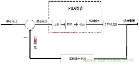 由于輸入電壓隨著負(fù)載變大會(huì)有降低,切系統(tǒng)濾波電感具有電阻成分,這些因素導(dǎo)致在系統(tǒng)開(kāi)環(huán)下負(fù)載調(diào)整率較大,因此本系統(tǒng)采用閉環(huán)反饋調(diào)整輸出電壓穩(wěn)定在10V。我們選用經(jīng)典PID反饋調(diào)整,對(duì)輸出電壓進(jìn)行采樣,與參考電壓比較得到誤差電壓后進(jìn)行位移式PID調(diào)節(jié),PID運(yùn)算輸出作為SPWM的調(diào)制度K,與正弦波表相乘后形成新的波表進(jìn)行生成SPWM波運(yùn)算。用此方法后負(fù)載調(diào)整率降到了1%以下,圖5是反饋過(guò)程框圖。
