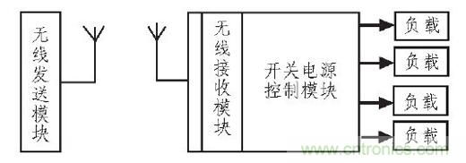 本系統(tǒng)由無線發(fā)送模塊、無線接受模塊和開關電源控制模塊3部分組成,其系統(tǒng)構成如圖1所示。