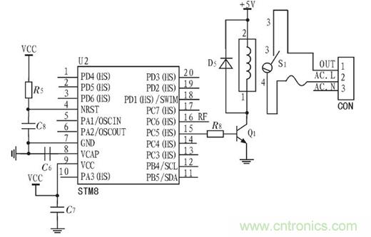 控制模塊主要由處理器單片機、繼電器和外圍元件組成開關電源,con端接入交流照明電,AC-L和AC-N分別接入交流電火線和零線,OUT端連接負載,此系統(tǒng)可以控制多路負載,實驗中該控制模塊連接了一個繼電器控制一路負載,控制模塊電路圖如圖5所示。