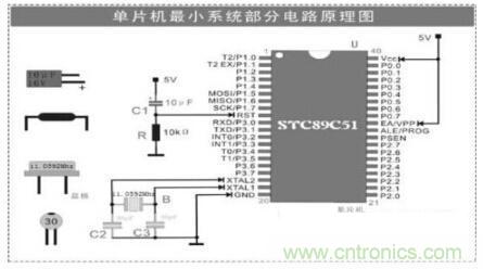STC89C51使用11.0592MHz的晶體振蕩器作為振蕩源,由于單片機(jī)內(nèi)部帶有振蕩電路,所以外部只要連接一個晶振和兩個電容即可,電容容量一般在15pF至50pF之間。