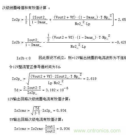 上面是次級(jí)電流有效值的計(jì)算,斷續(xù)模式的,并且加入了次級(jí)電流連續(xù)或者斷續(xù)的判斷,(判斷這一步其實(shí)沒有必要,因?yàn)樽儔浩鞒跫?jí)連續(xù),次級(jí)也連續(xù),初級(jí)斷續(xù),次級(jí)也斷續(xù)。)