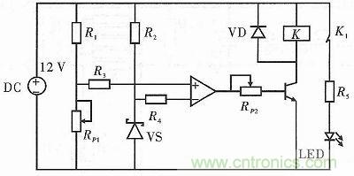 合理的蓄電池充放電,不僅可以延長蓄電池壽命,且能提升整個電路系統(tǒng)的穩(wěn)定性。因此需要設計保護電路,以保證蓄電池能在一定的電壓范圍內進行充放電。本項目使用3級級聯(lián)的12 V鉛酸蓄電池。由于過充電路與過放電路有相似性,本文只給出蓄電池的過放電路,如圖5所示。電源電壓正常時,調節(jié)電位器RP1使放大器的同相輸入端的電位略高于反相輸入端的電位,此時放大器輸出低電平,VT截止,電路正常工作。當電源電壓<10.5 V時,反相輸入端的電位大于同相輸入端的電位,放大器會輸出高電平,調節(jié)RP2,使VT導通,此時負載與電源斷開。