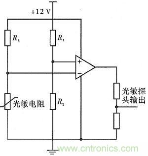 其由光電轉換模塊和光敏電阻組成。光電轉換由比較器來實現(xiàn)。當光敏探頭感應的光照強度不強時,比較器會輸出高電位,否則輸出低電位。具體電路如圖6所示。R1分擔電路電壓,依照外界環(huán)境條件,選擇適當?shù)碾娮鑂2,控制比較器中正相輸入的電壓值,使其作為比較器工作的參考電壓;R3起到保護光敏電阻以及分壓的作用。光敏電阻的阻值隨著外界光強的變化而變化,這樣就可將光信號變換成電壓信號,以此作為信號電壓連接到比較器的反相輸入端。比較兩個輸入端的電壓大小。若信號電壓較小,比較器輸出高電平,否則比較器輸出低電平。從而實現(xiàn)在明亮條件下輸出低電平,在黑暗條件下輸出高電平的設計要求。