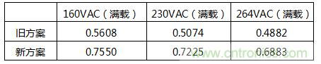 以下所有表中舊方案為采用電解電容的產(chǎn)品,新方案為采用填谷電路無電解電容的新產(chǎn)品