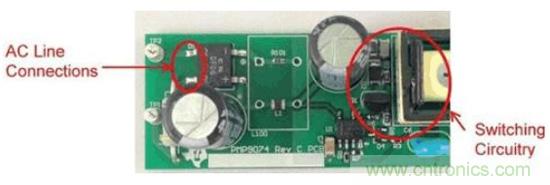 圖1是這些非計(jì)劃中電容的一個(gè)實(shí)例。圖中的右側(cè)是一個(gè)垂直安裝的FET,所帶的開(kāi)關(guān)節(jié)點(diǎn)與鉗位電路延伸至了圖片的頂部。輸入連接從左側(cè)進(jìn)入,到達(dá)距漏極連接1cm以內(nèi)的位置。這就是故障點(diǎn),在這里FET的開(kāi)關(guān)電壓波形可以繞過(guò)EMI濾波器耦合至輸入。