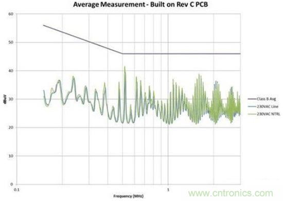 圖4是修改后的效果圖。我們?cè)诠收宵c(diǎn)位置為EMI規(guī)范獲得了大約6dB的裕量。此外,我們還顯著減少了總體EMI簽名。所有這些改善都僅僅是因?yàn)椴季值恼{(diào)整,并未改變電路。如果您的電路具有高電壓開(kāi)關(guān)并使用了屏蔽距離,您需要非常小心地對(duì)其進(jìn)行控制。