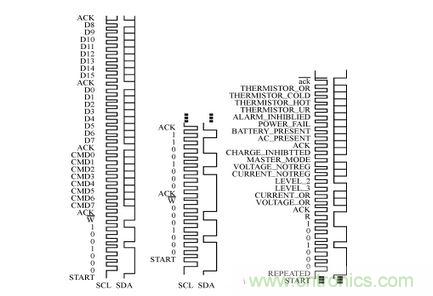 從圖4可見:89C51與MAX1647通信的開始條件是SDA端口為下降沿,同時SCL端口為高電平;MAX1647的 WRITE-WORD協(xié)議為0b00010010(0b表示二進制),或者可表示為0x12(0x表示十六進制);READ-WORD協(xié)議則可表示為 0b00010011或者0x13。另外,CMD0~CMD7代表具體的命令,D0~D15表示數(shù)據(jù)位。幾個常用的WRITE-WORD協(xié)議命令:ChargerMode()命令,命令代碼為0x12,主要用于清零和復(fù)位;ChargingVolage()命令,命令代碼為0x15,主要用于電壓預(yù)置;ChargingCurrent()命令,主要用于電流預(yù)置,命令代碼為0x14,即CMD7~CMD0的數(shù)據(jù)為00010100,16位二進制數(shù)值由D15~D0組成表示Io的電流值,單位為mA。當端子SEL與AGND短接時,電流Io的最大預(yù)置值為1.023A;如果讓端子SEL懸空,則 Io的最大預(yù)置值為2.047A;當端子SEL與VL短接,則Io的最大預(yù)置值為4.095A。MAX1647提供兩個電流源給負載供電:一個來自內(nèi)部的線性電流源IOUT,一個是開關(guān)電路提供的電流。IOUT提供1mA~31mA的電流(步長為1mA)。例如,當Io最大預(yù)置值為4.095A時,數(shù)據(jù)位 D11~D6對應(yīng)為6位電流預(yù)置DAC的DA5~DA0位;數(shù)據(jù)位D4~D0對應(yīng)輸出電流IOUT的I4~I0,表示IOUT線性電流源二進調(diào)整數(shù)。注意任何時候DAC位被置位,線性電流源被調(diào)整至滿幅(31mA)。AlarmWarning()命令,命令代碼為0x16,主要用于保護設(shè)置;ChargerStatus()命令,命令代碼為0x13,主要用于返回溫度傳感器以及MAX1647的內(nèi)部信息,這些信息暫存D15~D0位中。