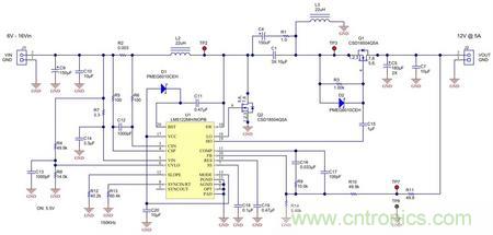SEPIC擁有兩個開關(guān)節(jié)點(diǎn)(TP2、TP3),而不是單個升壓的開關(guān)節(jié)點(diǎn)。SEPIC同步場效應(yīng)晶體管(FET)(Q1)的柵極不能直接連接到升壓型控制器的高側(cè)驅(qū)動器,因為它的源極(TP3)與它的SW引腳(TP2)不在同一電位。為了驅(qū)動它,筆者添加了一個由R3/D2/C15構(gòu)成的浮動電平移位器電路。C15具有跨越其兩端的VIN的電壓降,這與“快速”電容器C1的電壓相同,從而能提供跨Q1柵極至源極的正確電壓擺幅。R3/D2可恢復(fù)正確的柵極驅(qū)動器偏移量(低 = - 0.5V,高 = 7V)。