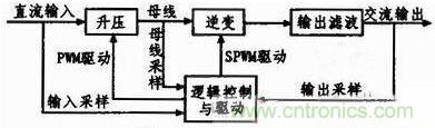 系統(tǒng)的整體框架如圖1所示。系統(tǒng)采用高頻逆變方案,即前級升壓加后級逆變的結(jié)構(gòu),這樣可以避免使用笨重的工頻變壓器,有效的降低了電源的體積、重量及成本,提升電源的效率。電路的工作原理是,12 V的直流輸入電壓經(jīng)過濾波后由推挽升壓和全橋整流升壓到350 V的直流母線電壓,再經(jīng)過全橋逆變電路轉(zhuǎn)變?yōu)?20 V/50 Hz的工頻交流電,采樣電路對相應(yīng)點進行采樣,以實現(xiàn)閉環(huán)控制及保護功能。