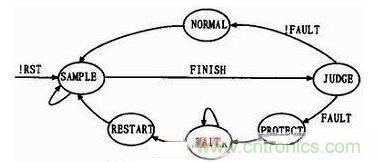 為了提高系統(tǒng)的可讀性以及代碼效率,軟件采用狀態(tài)機思想設(shè)計,圖5所示為系統(tǒng)的狀態(tài)轉(zhuǎn)換圖。系統(tǒng)上電復(fù)位后進入SAMPLE采樣狀態(tài),若檢測到采樣完成標(biāo)志FINISH則進入JUDGE狀態(tài)進行判斷,如果FAULT不為0即有故障信號(過壓/欠壓、過載、短路),則進入PROTECT狀態(tài)關(guān)閉輸出,并跳轉(zhuǎn)到WAIT狀態(tài)等待故障信號消除。當(dāng)故障信號消除后,系統(tǒng)軟重啟,開始新的采樣及檢測。JUDGE狀態(tài)后如果未檢測到故障信號,則進入NORMAL正常狀態(tài),進行電壓調(diào)整。