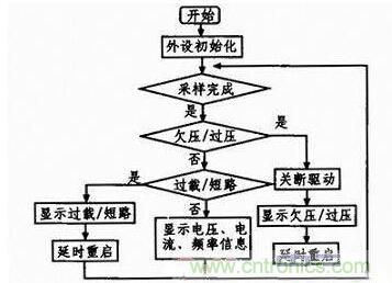 系統(tǒng)上電后,首先完成各個外設(shè)的初始化,主要包括系統(tǒng)時鐘、定時器、GPIO口、ADC、DMA、中斷及SPI的初始化。在此,定時器和中斷一旦初始化完成,PWM及SPWM波就會生成??紤]到過流、短路保護及反饋穩(wěn)壓的實時性要求較高,故在中斷內(nèi)完成。欠壓、過壓對實時性要求低,放在主程序內(nèi)。為提升系統(tǒng)的性能,ADC采樣使用DMA方式傳輸數(shù)據(jù),傳輸完成后,發(fā)出中斷申請,對采集到的數(shù)據(jù)進行簡單濾波處理,其他功能函數(shù)調(diào)用此數(shù)據(jù)完成相應(yīng)的保護及穩(wěn)壓功能。主程序的流程圖如圖6所示。