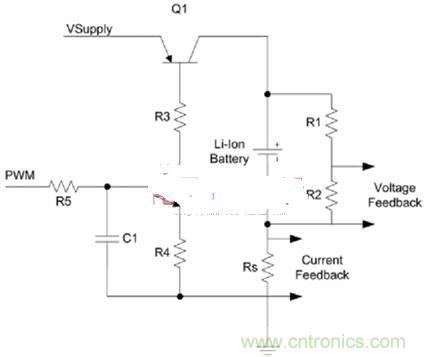 通過控制串聯(lián)導通晶體管Q1的偏置實現(xiàn)對充電電流的控制??墒褂脭?shù)模轉(zhuǎn)換器(ADC)或脈寬調(diào)制器(PWM)配合外部RC低通濾波器來控制偏置。線性方法適用于充電電流(<1A)較低的情況,因為串聯(lián)導通元件會面臨功率消耗問題。