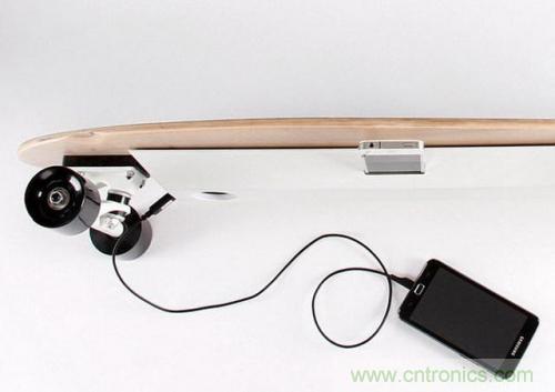 去年由荷蘭鹿特丹市的一位大學(xué)生設(shè)計(jì)的一款能對(duì)手機(jī)充電的滑板獲得了關(guān)注?;遢喿由系陌l(fā)電機(jī)旋轉(zhuǎn)運(yùn)行時(shí)可產(chǎn)生6伏電流,電流轉(zhuǎn)換成為5伏之后進(jìn)入滑板的盒子裝置中,滑板運(yùn)行1個(gè)小時(shí)所產(chǎn)生的電能可完全對(duì)一部手機(jī)充電,并且運(yùn)動(dòng)得越多,充電滑板存儲(chǔ)的電量就越多,最多可為手機(jī)進(jìn)行8次充電。