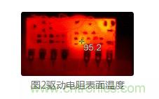 有時,電路參數和性能看似正常,但實際上隱藏很大的問題。如圖 2所示,某電路基本性能沒有問題,但在常溫下,用紅外熱成像儀一測,不得了了,MOS管的驅動電阻表面溫度居然達到95.2℃。長期工作或高溫環(huán)境下,極易出現(xiàn)電阻燒壞、模塊損壞的問題。可見,研發(fā)過程中使用熱成像儀測試元器件的溫度尤其重要,可及時發(fā)現(xiàn)并定位問題點。通過調整電路參數,降低電阻的歐姆熱損耗,且將電阻封裝由0603改成0805,大大降低了表面溫度。