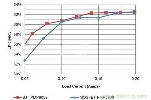 在低功耗(3W 及以下)反激式電源中,很難在成本上擊敗 BJT。大批量購買時,一個 13003 NPN 晶體管價格可低至 0.03 美元。該器件不僅可處理 700V VCE,而且無需過大的基流便可驅(qū)動幾百毫安的電流。使用 BJT,增益和功率耗散可能會將實際使用限制在低功耗應(yīng)用中。在這些低功耗標(biāo)準(zhǔn)下,MOSFET 與 BJT 之間的效率差異非常細(xì)微。下圖 1 對比了兩個相似 5V/1W 設(shè)計的效率。第一個設(shè)計是“230VAC 輸入、5.5V/250mA 非隔離式反激轉(zhuǎn)換器”使用 MOSFET,而另一個設(shè)計則是“120VAC 輸入、5V/200mA 反激轉(zhuǎn)換器”使用 BJT。這并不是完全公平的對比,因為這兩個電源在設(shè)計上采用不同的輸入電壓運(yùn)行,但它說明了它們的效率有多相似。