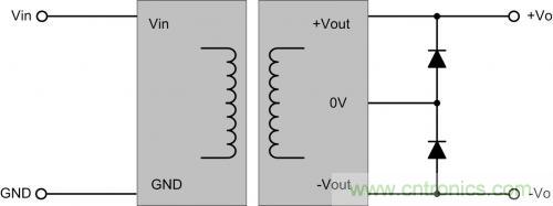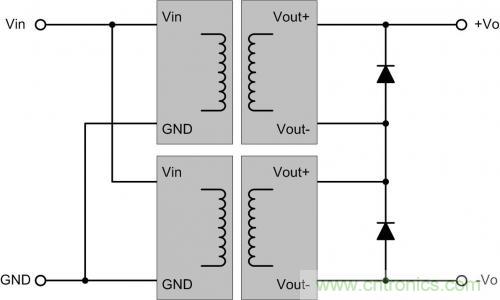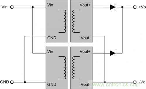 如一個5V轉(zhuǎn)±12V的電源,若臨時需要5V轉(zhuǎn)24V,可把負當?shù)?,正輸出?4V電源,輸出24VDC。應用時,在輸出各方向并聯(lián)一個二極管續(xù)流,防止兩路啟動時間不同,由一路通過負載給另一路的內(nèi)部電路充電。