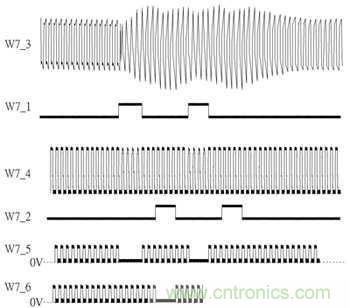參照?qǐng)D3錯(cuò)動(dòng)式訊號(hào)圖,W7_3為受電線圈訊號(hào)、W7_1與W7_2分別為P04與P11訊號(hào)、W7_4為S1訊號(hào),其與W7_3不同在于通過一個(gè)C1電容之諧振效果后取得較強(qiáng)電流推力,其波形也會(huì)接近方波訊號(hào);W7_5與W7_6分別為S12與S22訊號(hào),從圖3中可看到設(shè)計(jì)中的調(diào)制訊號(hào)從線圈兩端分別進(jìn)行調(diào)制,并分成調(diào)制單端、解除調(diào)制、調(diào)制另一單端后再解除調(diào)制完成,此設(shè)計(jì)的用意在于對(duì)受電線圈接收電力影響最小的情況下,產(chǎn)生最大調(diào)制訊號(hào)。