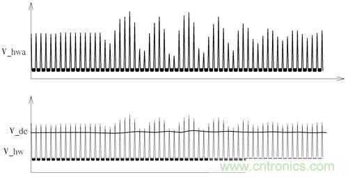 另外一路由D603透過分壓電阻R603、R604后輸入到OPA2作為差動(dòng)放大輸入端,其訊號(hào)為圖5中之V_hw訊號(hào)再經(jīng)OPA2放大后輸出為V_hwa訊號(hào),D603、D701用來控制V_dc與V_hw有相同的壓降,而R603、R604、R703、R704用來設(shè)定分壓比例使得V_dc能保持在略低于V_hw之訊號(hào),確保OPA2可以只放大波峰中高低變化之部分。