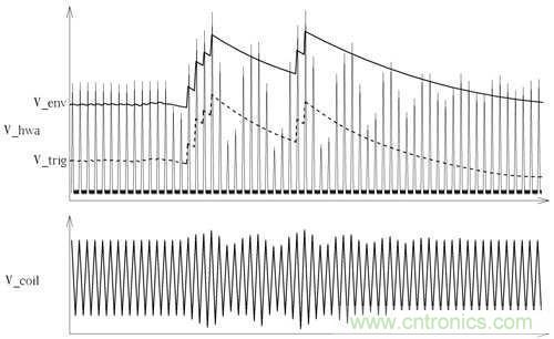 OPA2輸出訊號(hào)再傳送到D601、R612、C612為一檢波電路,參考圖6中經(jīng)過D601訊號(hào)為V_env該訊號(hào)為波峰訊號(hào)之檢波結(jié)果,但該訊號(hào)之直流穩(wěn)態(tài)非固定值,所以在透過C613、R614、R615構(gòu)成之去交連耦合電路得到之波形為V_trig,而該波型最后傳到TX-U1進(jìn)行解碼處理,在圖6中能看到原供電線圈上之訊號(hào)V_coil轉(zhuǎn)換到V_trig之差異。