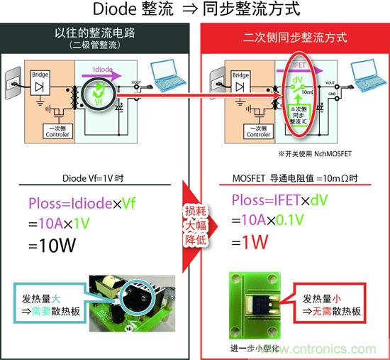 同步整流方式的整流元件使用MOSFET,通過更低的導(dǎo)通電阻(低Ron)來降低導(dǎo)通損耗(圖1)。工作與一次側(cè)的開關(guān)工作同步使整流元件的MOSFET進(jìn)行ON/OFF。