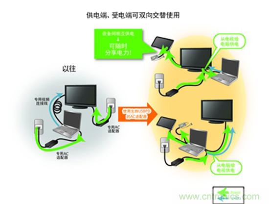 USB PD通過USB連接可實現(xiàn)高達(dá)100W的供電。USB PD根據(jù)不同設(shè)備的電源電壓要求,來調(diào)整AC/DC適配器等電源的輸出電壓。以往每臺設(shè)備都需要電源,而利用USB PD則可共享1個電源。另外,以往在設(shè)備之間主要 是數(shù)據(jù)通信,而通過USB PD可同時實現(xiàn)雙向相互供電(圖3)。