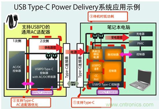 ROHM不僅擁有滿足以往的USB Type-A/B標(biāo)準(zhǔn)的USB PD控制IC(BD92S系列)產(chǎn)品,還新開發(fā)出滿足最新的USB Type-C標(biāo)準(zhǔn)Rev1.1和USB PD標(biāo)準(zhǔn)Rev2.0的USB PD控制IC(BM92T系列)。BM92T系列在以往僅可 供電10W左右的滿足Type-C標(biāo)準(zhǔn)的設(shè)備之間,可實現(xiàn)高達(dá)100W(20V / 5A)的供受電。由此,電腦和電視等需要 大功率的設(shè)備,也可通過USB端子供電來帶動(圖4)。