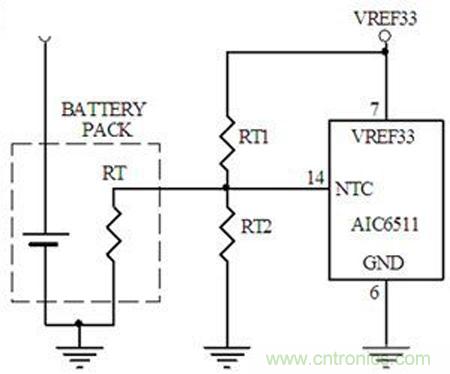 圖5為電池溫度偵測(cè)電路,透過(guò)圖4中NTC腳位(Pin 14)偵測(cè)NTC熱敏電阻的電壓,充電IC能持續(xù)偵測(cè)電池的溫度,確保電池溫度的安全操作范圍。