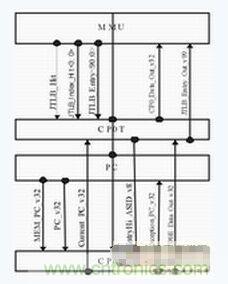 協(xié)助TLB進(jìn)行虛實(shí)地址轉(zhuǎn)換是CP0的主要功能之一。TLB屬于系統(tǒng)的特權(quán)資源,只有CP0有權(quán)對(duì)其進(jìn)行訪問(wèn),因此CP0與TLB之間的連線較多,數(shù)據(jù)交換的時(shí)延也比較關(guān)鍵。同時(shí),PC模塊與CP0的數(shù)據(jù)交換也非常重要。因此,CP0單元在版圖上最好同時(shí)靠近TLB和PC模塊。本設(shè)計(jì)將CP0中與TLB相關(guān)的邏輯與寄存器獨(dú)立為CP0T,放在MMU與PC模塊之間;CP0的其余部分歸為CP0E,放在PC下部,也就是整塊芯片的最下端。如下圖所示?! ?/div>
