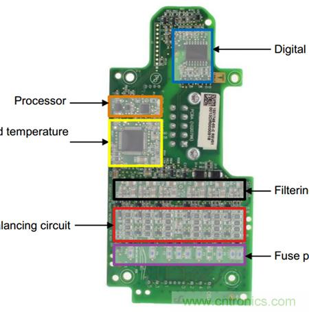 因為兩種均衡功能各有利弊,本來主動均衡功能是可以替代被動均衡功能的,但因為結(jié)構(gòu)復(fù)雜成本高,而且結(jié)構(gòu)復(fù)雜之后故障率也會高而與被動均衡處于膠著狀態(tài),業(yè)內(nèi)人士常為了哪種均衡更好爭論不休。特斯拉的BMS均衡功能(被動均衡,見下圖中Cellbalancingcircuit中所指均為放電電阻)經(jīng)常被示范以證明被動均衡強于主動均衡。其實這反而證明了任何技術(shù)選擇都要和整體條件適用的道理。