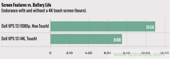 拋開(kāi)電池技術(shù)本身止步不前的原因,筆記本電腦電池壽命沒(méi)有進(jìn)步的主要原因在于其他硬件發(fā)展。雖然處理器每一年都在功耗方面擁有一定進(jìn)步,但4K屏幕、觸摸屏、超輕薄設(shè)計(jì),對(duì)電池壽命都產(chǎn)生了消極的影響。以戴爾XPS 13為例,1080P非觸摸屏版本相比4K觸摸屏版本的電池壽命長(zhǎng)了約4小時(shí)。
