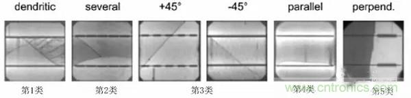 2011年,德國(guó)ISFH公布了他們的研究結(jié)果:根據(jù)電池片隱裂的形狀,可分為5類:樹(shù)狀裂紋、綜合型裂紋、斜裂紋、平行于主柵線、垂直于柵線和貫穿整個(gè)電池片的裂紋。