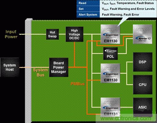 (2)另一常見的系統(tǒng)電源要求是能夠進(jìn)行遠(yuǎn)程監(jiān)視,對(duì)電源各參數(shù)進(jìn)行實(shí)時(shí)監(jiān)視、故障報(bào)警和相應(yīng)調(diào)節(jié)。而最簡單、最便宜、最緊湊的方式是使用集成了遠(yuǎn)程監(jiān)視功能和相應(yīng)的通信總線的電源調(diào)節(jié)器。通過智能電壓ID(SmartVID)特性,Altera的Arria 10 FPGA和SoC通過PMBus接口,確定與Enpirion電壓調(diào)節(jié)器系統(tǒng)之間所需的VCC電壓和通信,將內(nèi)核電壓軌盡可能動(dòng)態(tài)調(diào)整到最小,而不會(huì)犧牲系統(tǒng)性能。同時(shí),支持PMBus的Enpirion的ED8101P0xQI單相數(shù)字控制器,與ET4040QI大電流電源配對(duì)使用,可實(shí)現(xiàn)對(duì)FPGA的多種遠(yuǎn)程監(jiān)視和低功耗特性。