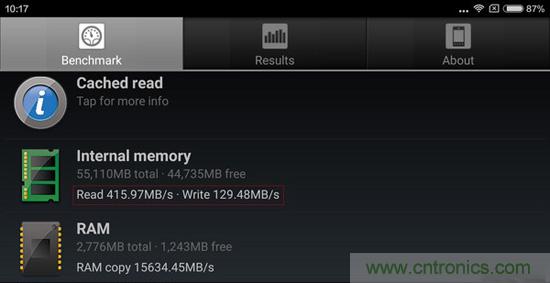 聊了這了這么多,UFS 2.0閃存的讀寫速度究竟有多快呢?相信這是不少朋友想要急切了解的。接下來,我們將通過終端產(chǎn)品的實測數(shù)據(jù)來說話。在專業(yè)存儲卡測速工具——“A1 SD Bench”的速度測試中,小米5(高配版)機身存儲(注:UFS 2.0閃存)讀取速度為415.97MB/s,寫入速度則為129.48MB/s。