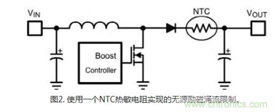 最簡(jiǎn)單的限流機(jī)制是采用一個(gè)負(fù)溫度系數(shù) (NTC) 熱敏電阻(圖2)。由于在冷卻時(shí)出現(xiàn)高阻抗,NTC在開始啟動(dòng)時(shí)限制勵(lì)磁涌流。其自身功率耗散所導(dǎo)致的自發(fā)熱可使阻抗下降,從而能夠使更多的電流流過(guò)。這個(gè)方法的優(yōu)勢(shì)在于簡(jiǎn)便易行且成本低廉。然而,在惡劣條件下使用這個(gè)方法會(huì)帶來(lái)某些缺點(diǎn)。比如,在汽車發(fā)動(dòng)機(jī)艙等溫度大幅變化的環(huán)境內(nèi),會(huì)出現(xiàn)使NTC初始阻抗降低的高環(huán)境溫度;此外,如果不仔細(xì)管理整個(gè)環(huán)境運(yùn)行條件,就會(huì)導(dǎo)致過(guò)多的勵(lì)磁涌流。如果出現(xiàn)重新啟動(dòng)的情況,NTC器件溫度也許會(huì)在下一次加電之前尚未冷卻。在輸出電容完全放電時(shí),由于散熱速度較慢,NTC對(duì)于勵(lì)磁涌流的限制會(huì)變到最低。此外,如果負(fù)載出現(xiàn)短路故障,NTC將無(wú)法限制比所選標(biāo)稱運(yùn)行條件高的電源電流。最后,NTC方法對(duì)于單一功能保護(hù)有效,但是由于使用的是無(wú)源組件,這個(gè)方法也會(huì)受到某些限制。