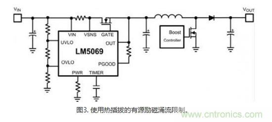 選擇像MOSFET這樣的主動(dòng)限制裝置需要一個(gè)勵(lì)磁涌流限制控制器的控制電路,它也被稱為熱插拔控制器或電子熔絲。這是一個(gè)位于升壓控制器之前的附加集成電路 (IC),很多此類的控制器(圖3)特有包含電流和電壓環(huán)路的可編程涌入限制,旨在確保MOSFET保持在安全工組區(qū) (SOA) 內(nèi)的同時(shí),控制涌入率。SOA用于監(jiān)視維持關(guān)鍵保護(hù)器件的長(zhǎng)期可靠性。此外,涌入控制器會(huì)具有兩個(gè)電流閥值:一個(gè)用于規(guī)范涌入限制,第二個(gè)是在嚴(yán)重過(guò)流情況下用于完成