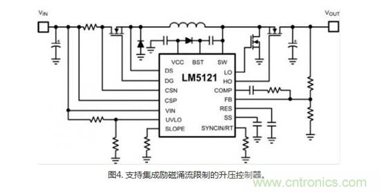 第三個(gè)保護(hù)選項(xiàng)是一個(gè)具有集成涌入限制控制的升壓控制器。這個(gè)方法仍然需要將一個(gè)附加的MOSFET用作保護(hù)器件,因?yàn)樯龎旱母叨嗽ㄒ粋€(gè)續(xù)流二極管或同步MOSFET)無(wú)法反向。然而,如圖4所示,與熱插拔控制器方法相比,將升壓和保護(hù)控制集成在一個(gè)IC中有助于降低解決方案復(fù)雜度和尺寸,同時(shí)也提供了很多其它保護(hù)特性。