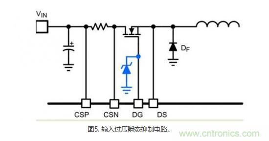 需牢記的一點(diǎn)是,雖然將MOSFET用于保護(hù)功能可實(shí)現(xiàn)對(duì)涌入或故障情況的快速響應(yīng),但是你應(yīng)該在MOSFET的輸出端上執(zhí)行一個(gè)適當(dāng)?shù)碾妷壕彌_,以確保用于保護(hù)功能的器件不會(huì)使下游電路出現(xiàn)問(wèn)題。在升壓電路中,保護(hù)器件之后出現(xiàn)的第一個(gè)直插式組件是原邊電感器。續(xù)流二極管可以管理保護(hù)MOSFET與電感器之間的任何電壓振鈴,它只有在保護(hù)開關(guān)迅速關(guān)閉時(shí)才會(huì)導(dǎo)電,特別是在斷路器位于電感器左側(cè)時(shí)(圖5)。