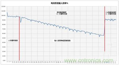 開(kāi)啟主動(dòng)均衡控制后(均衡電流為25%,電池系統(tǒng)相同),從第160到180次(合計(jì)20次循環(huán)),輸入效率恢復(fù)到85%-95%之間。