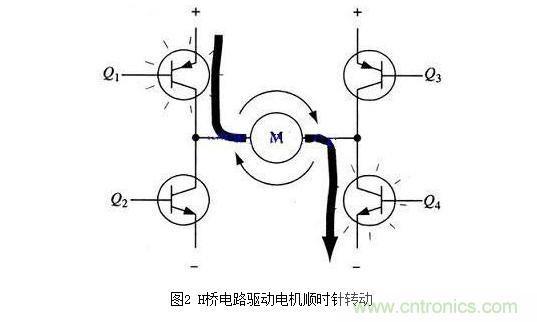 要使電機運轉,必須使對角線上的一對三極管導通。例如,如圖2所示,當Q1管和Q4管導通時,電流就從電源正極經(jīng)Q1從左至右穿過電機,然后再經(jīng)Q4回到電源負極。按圖中電流箭頭所示,該流向的電流將驅動電機順時針轉動。當三極管Q1和Q4導通時,電流將從左至右流過電機,從而驅動電機按特定方向轉動(電機周圍的箭頭指示為順時針方向)。