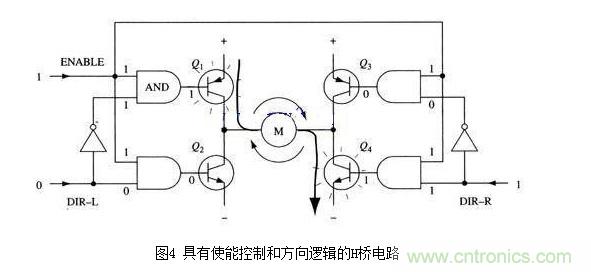 采用以上方法,電機的運轉就只需要用三個信號控制:兩個方向信號和一個使能信號。如果DIR-L信號為0,DIR-R信號為1,并且使能信號是1,那么三極管Q1和Q4導通,電流從左至右流經(jīng)電機(如圖5所示);如果DIR-L信號變?yōu)?,而DIR-R信號變?yōu)?,那么Q2和Q3將導通,電流則反向流過電機。